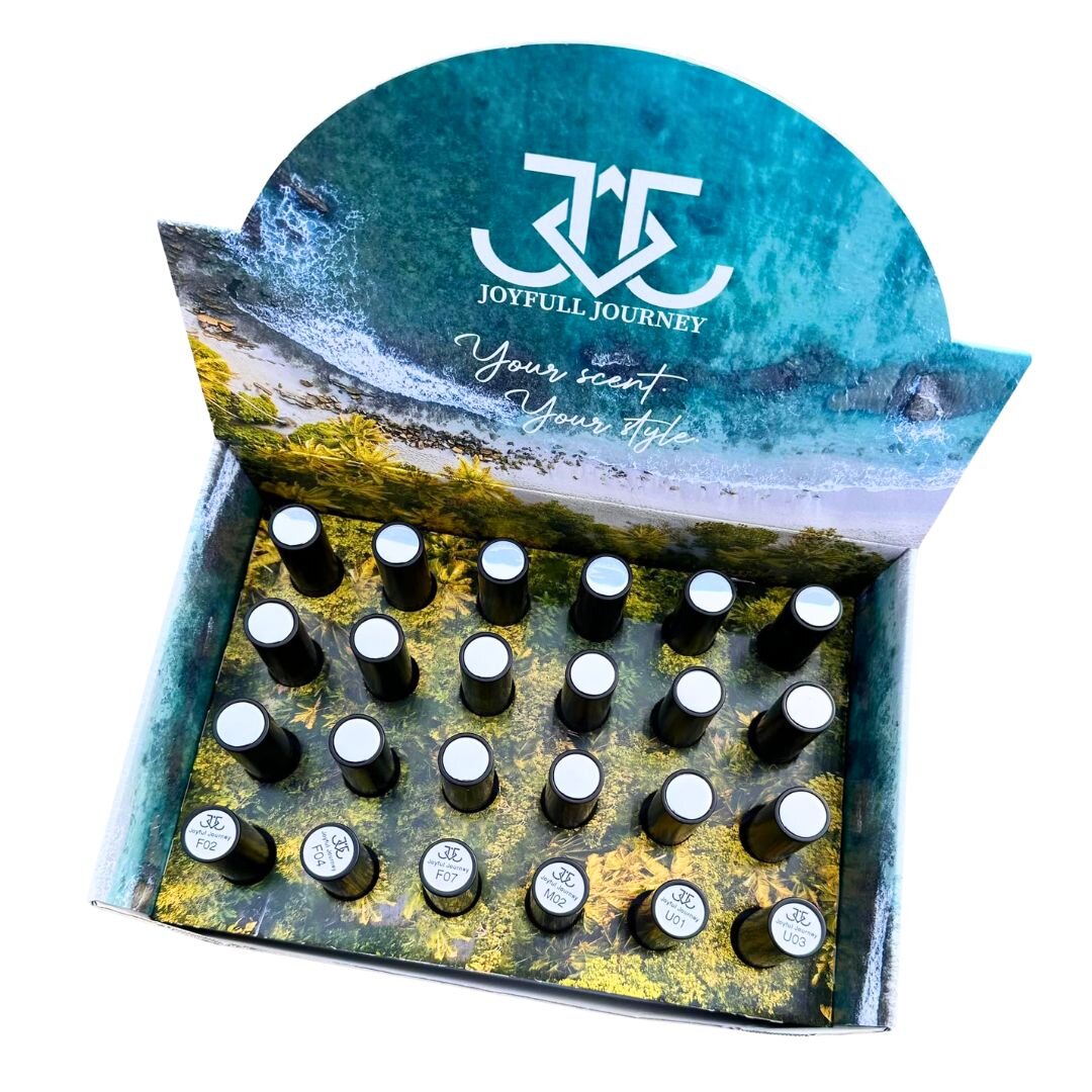 Joyfull Journey – your scent, your style. De displays bevatten in totaal 24 atomizers (tasparfum) van 8 ml, met 6 verschillende geuren. Aanbiedingsprijs per display met 24 stuks nu van €149,- voor €99,- excl.btw. Advies verkooprijs per atomizer vanaf €10,- (incl.btw) en het cadeaudoosje advies verkoopprijs €5,- (incl.btw)
